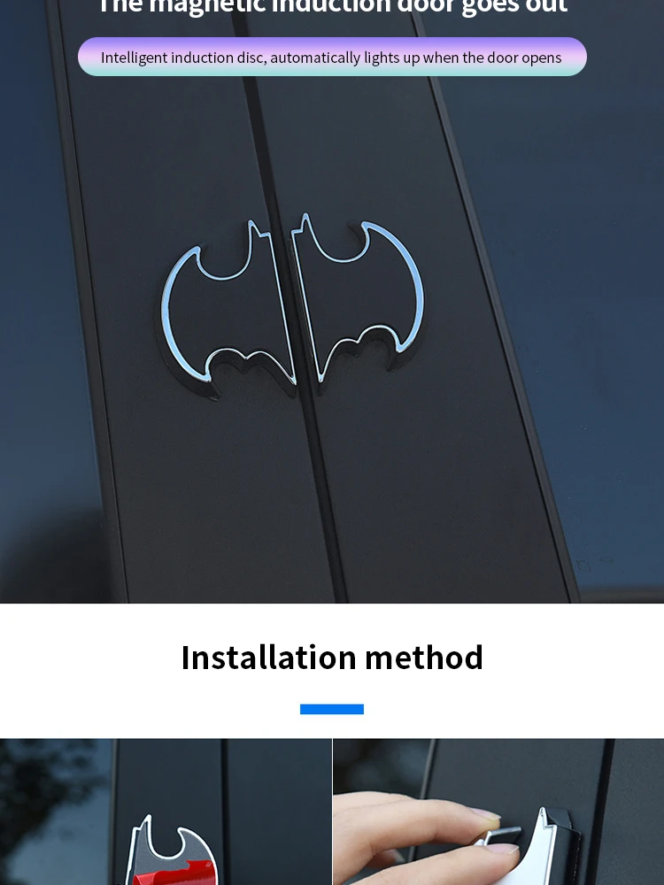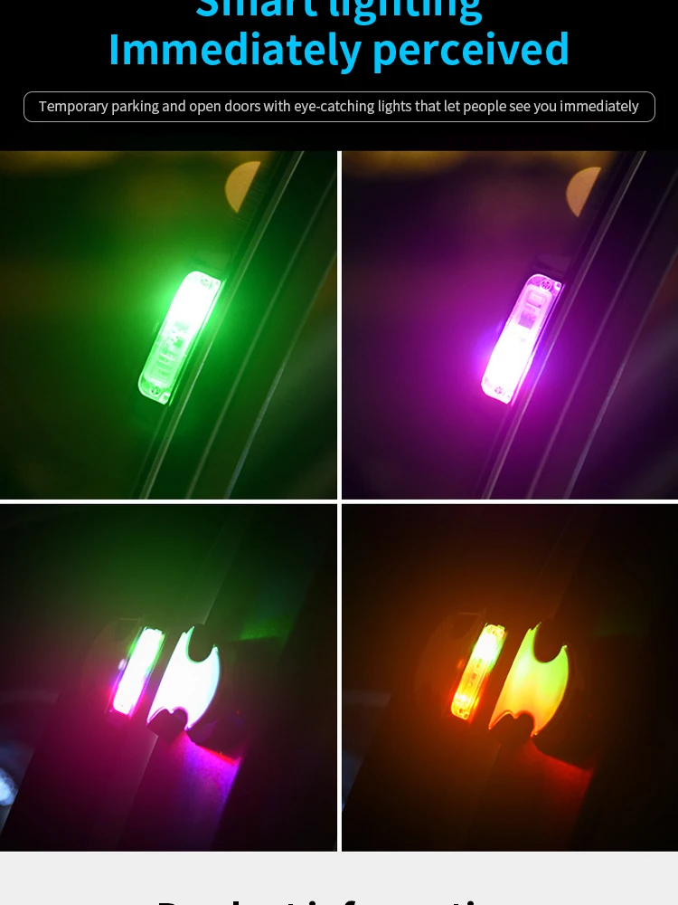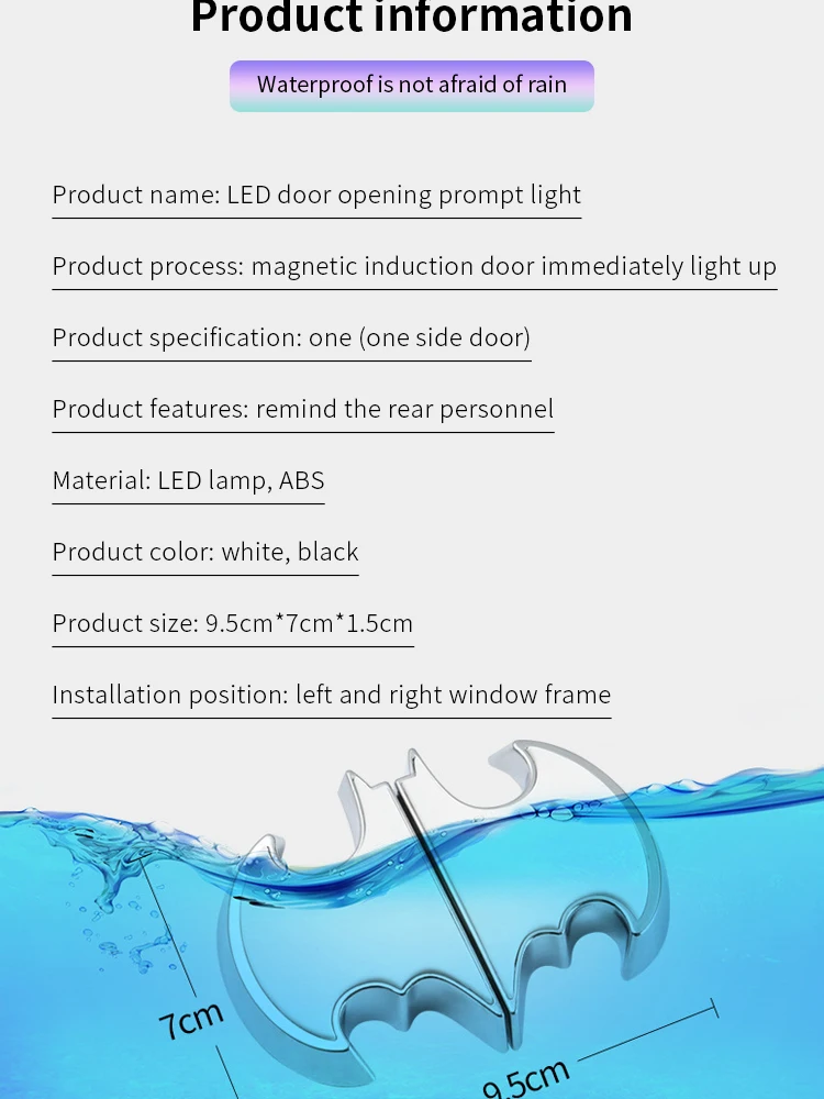 1. Беспроводной дизайн, легко установить, просто приклейте к двери и окну. 2. Магнитная индукция, она будет мигать автоматически, когда дверь открывается, и она автоматически выключается, когда дверь закрыта. 3. Форма летучей мыши, наполненная дизайном, может не только напоминать о транспортных средствах позади, чтобы избежать столкновения с задней частью, но также может использоваться в качестве украшения транспортного средства, чтобы добавить чувство моды. 4. Высококачественная полировка АБС гальваническим покрытием, водонепроницаемая и пылезащитная. 5,4 патронов для светодиодных лампочек, 4-цветная цикл мигающий, прохладный и несравнимо