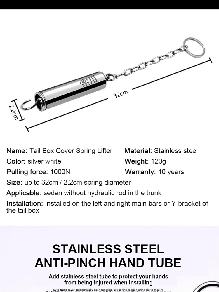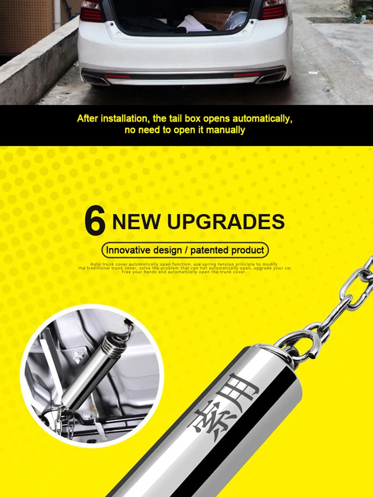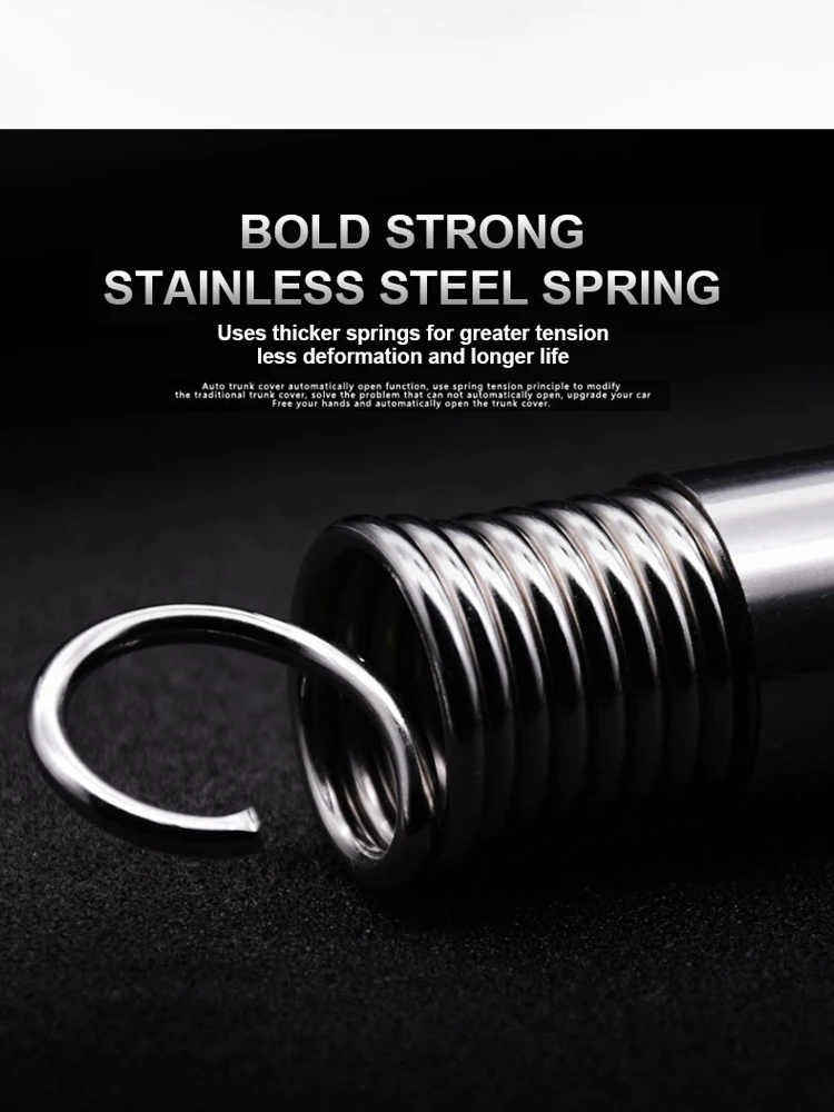 1. После установки нет необходимости вручную открывать крышку багажника автомобиля. Когда вы носите большие предметы, вы будете рады их получить; 2. Разблокировка одной кнопкой может автоматически поднять крышку ботинка, что является практичным и удобным; 3. Толстая прочная стальная пружина, материал из высокоэластичного сплава, прочность на растяжение до 1000N, долговечность; 4. Цилиндр ручки из нержавеющей стали предназначен для предотвращения зажатия руки во время установки, которая может защитить руку более гуманизированной; 5. Защита нескольких аксессуаров, без повреждений, простая установка, без затрат на техническое обслуживание