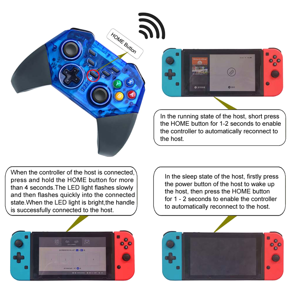 4. Для подключения контроллера к консоли во второй раз и далее, просто удерживайте кнопку home для 5S питания на контроллере, контроллер будет подключен к консоли автоматически.