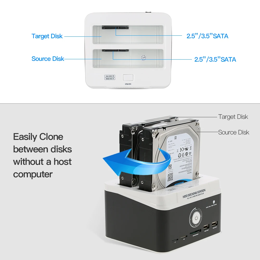 Легко и быстро переносить файлы с HD на ПК или картридеры, все-в-одном hdd док с одним касанием резервного копирования (OTB) и одним касанием клонирования (OTC).