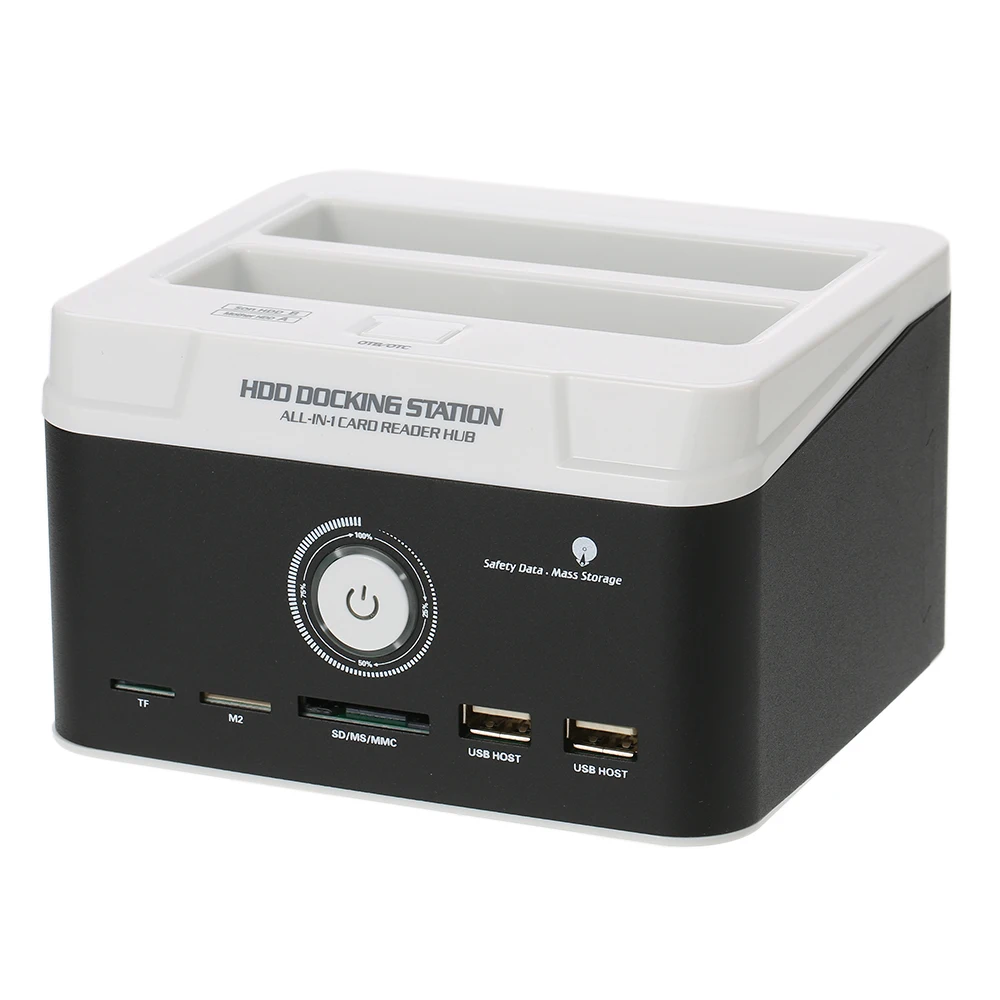 Все в 1 dual bay док-станция позволяет легкий доступ с двумя 2,5 дюймов и 3,5 дюймов SATA I/II/жесткий диск SSD, двухдиапазонный, wi 3 ТБ жёсткий диск с USB 3,0 концентратор, назад с USB 2,0/1,1. Высокоскоростной интерфейс USB 3,0 со скоростью передачи данных до 5 Гбит/с, в 10 раз быстрее, чем USB 2,0. Он поддерживает клонирование жесткого диска и резервное копирование программного обеспечения, высокая скорость от одного до одного исходного жесткого диска до целевого жесткого диска без соединение с компьютером. Бесплатная установка инструмента, не требуется драйвер, подключи и работай, поддержка горячей вилки. Он оснащен 5 слотами для нескольких карт памяти, поддержка карт до 32G, легкий и быстрый доступ к мультимедийным файлам. Светодиодный индикатор показывает состояние чтения и записи жесткого диска и источника питания, четкий и удобный.