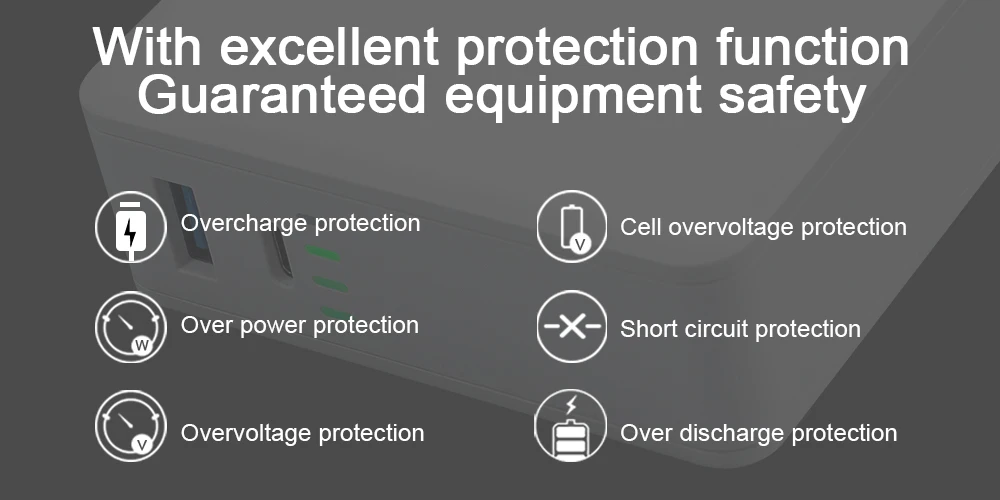 В мобильном блоке питания добавлен чип умной защиты. Защита входного тока, защита от короткого замыкания на выходе, предотвращение перезарядки, множество защитных инструментов могут гарантировать, что вы будете в безопасности и надежны в процессе использования этого продукта.