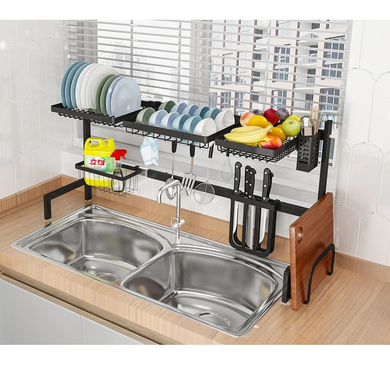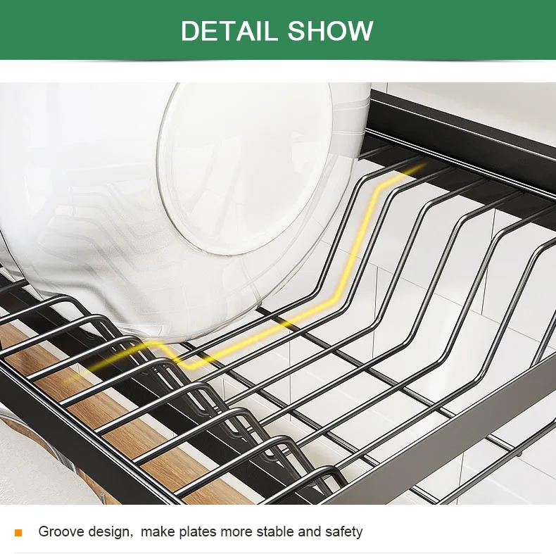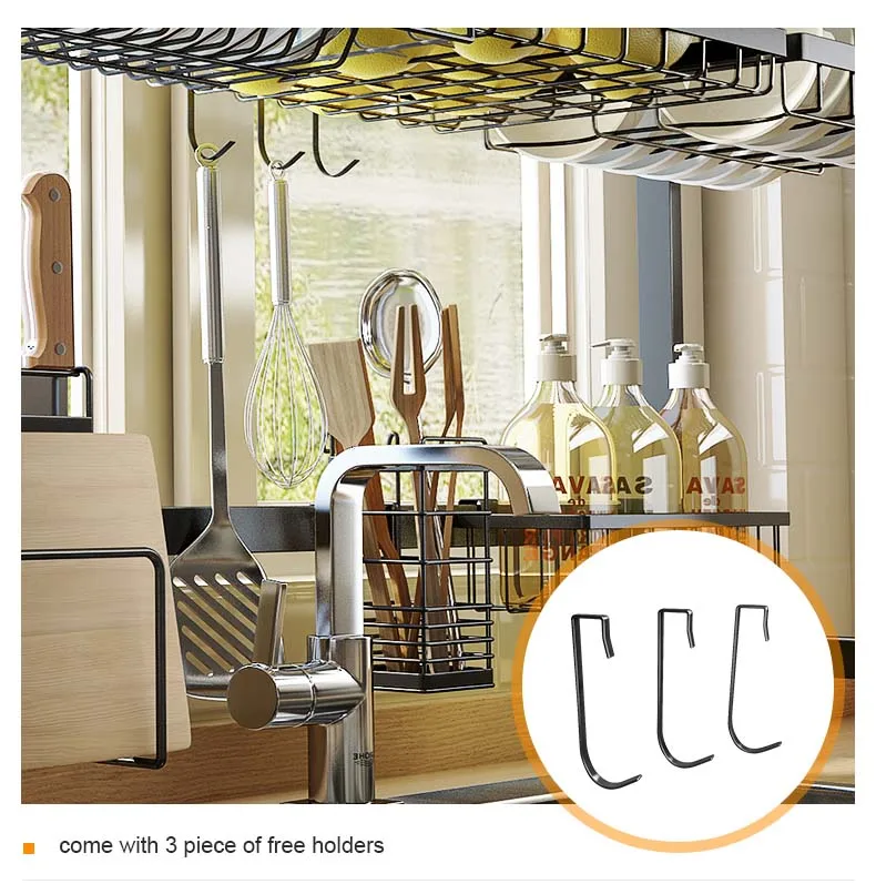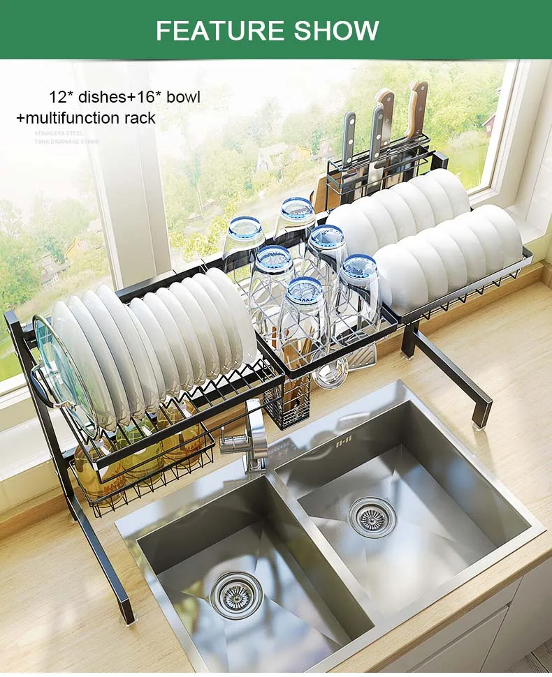 Материал: черный чехол для сушки посуды из нержавеющей стали, без ржавчины и высокой прочности Размер: внутренняя ширина --- подача заявки на 62/72/82/92/102 см (полный набор) Компактный и модный дизайн: над раковиной/плитой сушилка позволяет легко получить доступ к утвари и расходным материалам Противоскользящая присоска: амортизация и противоскользящая присоска, обеспечивают защиту вашей кухонной столешницы и сохраняют чистоту вашей кухни Пожалуйста, следуйте инструкциям по установке, чтобы собрать этот кухонный стеллаж для посуды Примечание: 62/72 см в комплект не входит корзина для фруктов и овощей ~~~