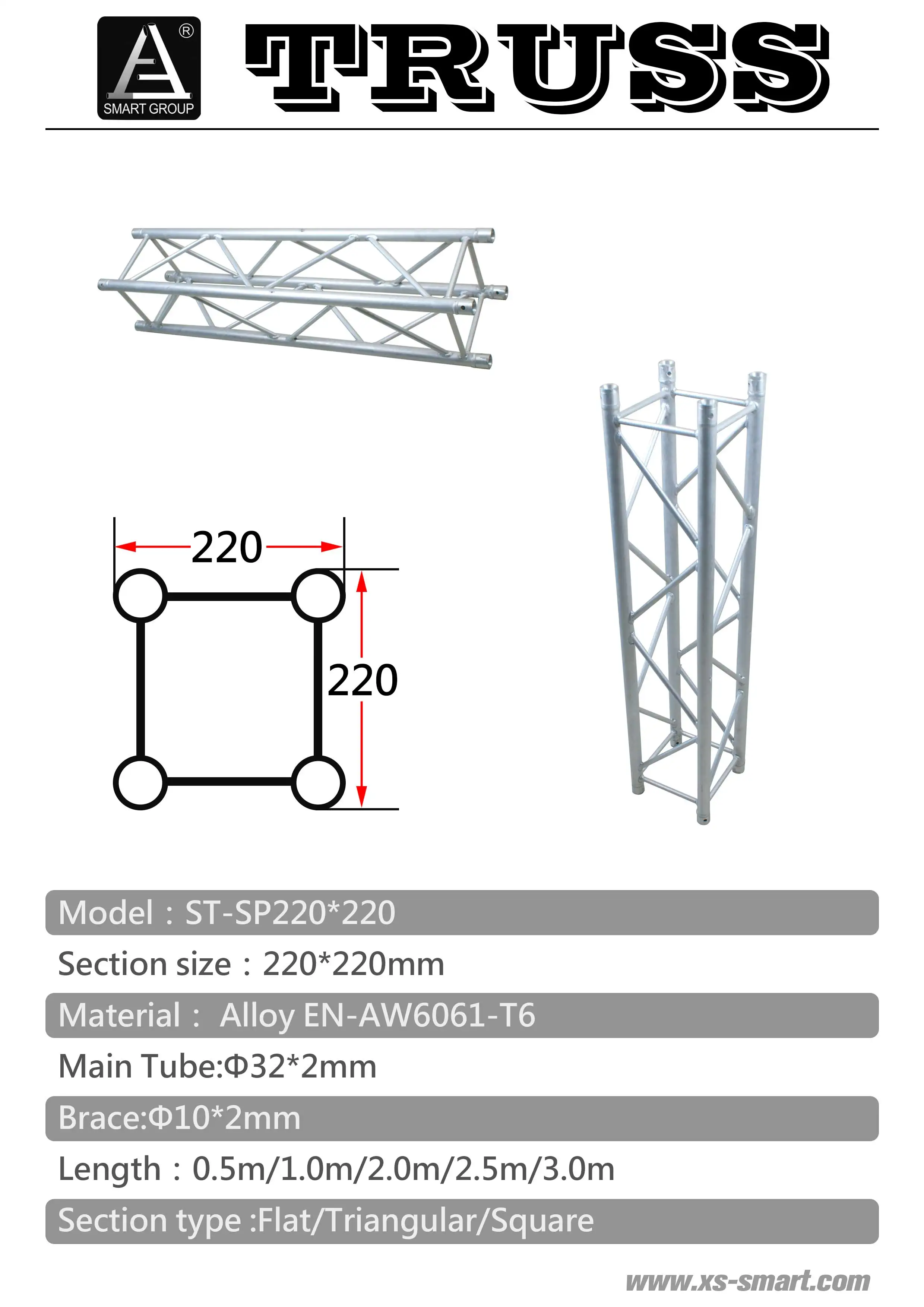 Размер секции: 220*220 мм Материал: сплав EN-AW6061-T6 Цвет: Доступно изготовление на заказ Основная трубка: 32*2 мм Бандаж: 10*2 мм Длина: 0,5 м/1,0 м/2,0 М/2,5 м/3,0 м/3,5 м/4,0 м Тип сечения: квадратный Преимущества: светильник с весом, легко собирается, моделирование является гибким. С TUV сертификацией, хорошее качество и Новинка Это универсальная ферменная конструкция, широко используемая для выставки, украшения, установки стены и так далее. Внимание, пожалуйста: Если вам требуется индивидуальное обслуживание или требуется более подробная информация, пожалуйста, свяжитесь со службой поддержки клиентов напрямую.
